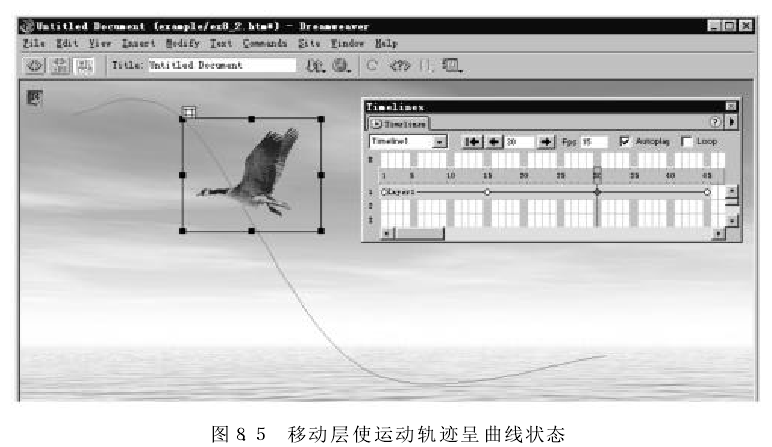上面我们讲到的动画是最简单的只有起点与终点的直线运动的动画。但如果仅让小鸟作直线飞行未免太生硬了些,能否让小鸟运动的路径是弯曲的呢?答案是肯定的,下面我们将介绍一个曲线运动的时间线动画实例。