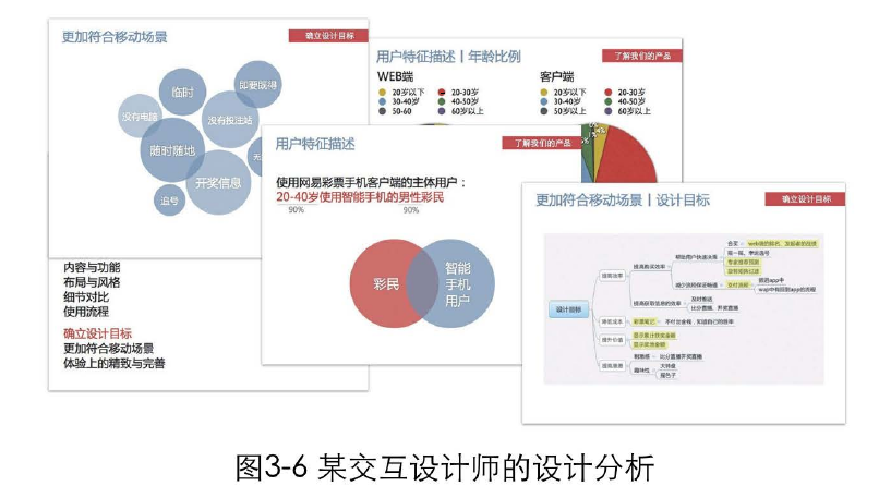 如果前三者你全都具备了,那么成为一个优秀的设计师只是时间的问题。快速学习一些基本的专业技能,再投身到一些项目中去,你就可以很容易地产出一些优质的作品,从而得到好的工作机会。某交互设计师的设计分析,如图3-6所示。某交互设计师的原型截图,如图3-7所示。