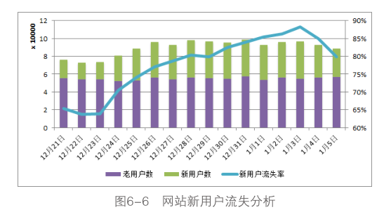 例如,网站的推广部门有个需求:网站在年底的圣诞和元旦双节日(12月24日到1月3日,为期11天)针对新用户做了一个促销推广活动,活动期限内新注册用户可以免费领取20元的现金抵价券,在3天有效期内购买任意商品时都可以使用,需要分析这次活动为网站用户数的增长所带来的效果。从活动的内容来看,活动的主旨是带动网站新用户的注册和消费,为网站积累用户数,既然针对新用户,可以对流失用户做进一步细分,分析活动期间新用户的流失情况,如图6-6所示。