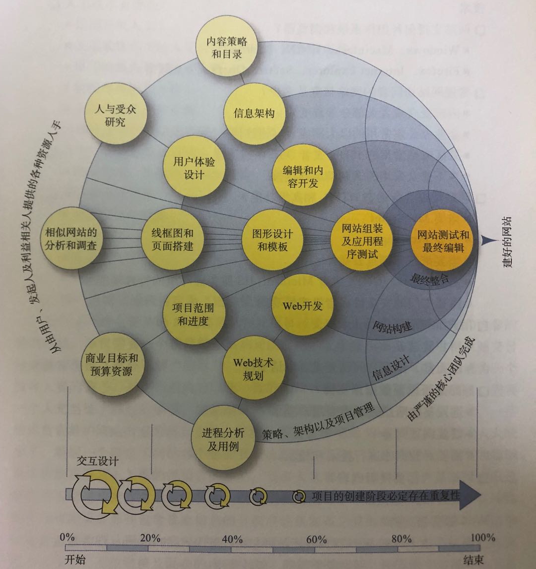 在考虑下面列出的网站制作开发过程时,注意:组成Web站点页面的架构是设计良好的项目中最后的一个步骤。要考虑到进程中的每个步骤及它对开发项目章程规划的影响。在着手前还要仔细考虑,并且确保已经备齐了确保项目成功进行的组织支持、预算和个人资源,如上图所示。