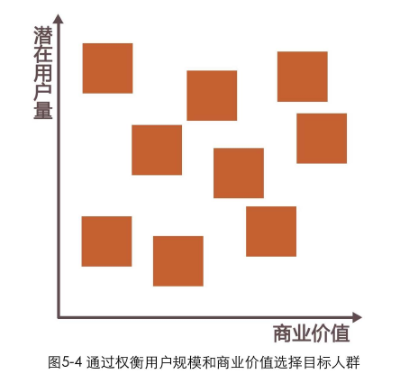 该选择哪种类型作为产品的目标用户,需要综合权衡用户对公司的价值以及潜在需求量。别忘了,平衡商业价值和用户需求本来就是设计师需要特别关注到的。在一个坐标平面上对潜在用户进行分布罗列,坐标平面的2个坐标轴分别是潜在用户量和商业价值(包含对推广、营销成本的考虑),如图5-4所示。我们优先考虑最右上角那些潜在用户量大和商业价值大(推广成本低)的用户。因为要同时考虑到产品利益和用户需求,所以这项工作最好由产品经理和设计师配合完成。