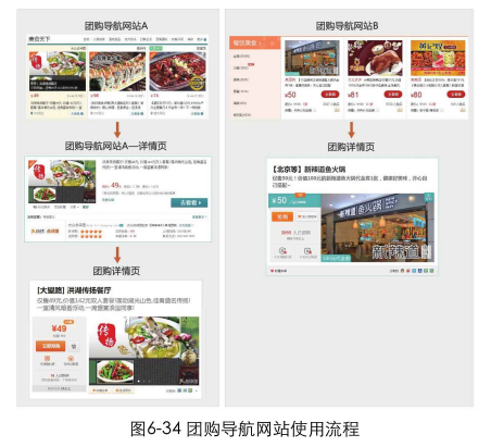 我们在团购时经常会用到“团购导航网站”。这类网站聚合了不同团购网站的商品。在有些团购导航网站的列表页点击某一商品时,首先会跳转到该导航网站的详情页。里面提供了一些团购商品的简介,但是并没有提供更多详情。如果我要团购一份双人晚餐,只知道商家和价格显然是不够的,我还需要知道具体有哪些配菜、餐馆的地址、有无消费限制、是否需要预约等信息。这些信息都会影响到我是否要购买。于是我还要点击导航网站详情页的“去看看”按钮跳转到我要购买产品的团购详情页。而有些团购导航网站,当我在列表页点击某一商品后,会直接跳转到我最后需要购买商品的那个页面,省去了中间多余的步骤。