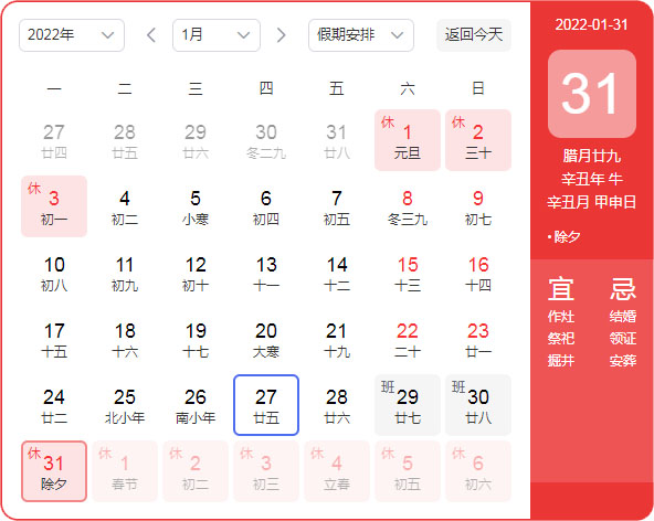 放假时间:2022年1月28日(周五)——2022年2月6日(周日),共十天。