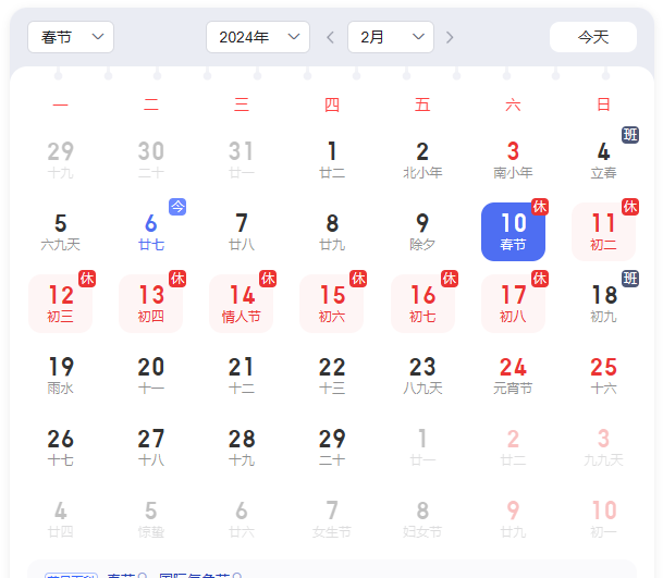 放假时间:2024年2月10日(周六)——2024年2月17日(周六),共八天。